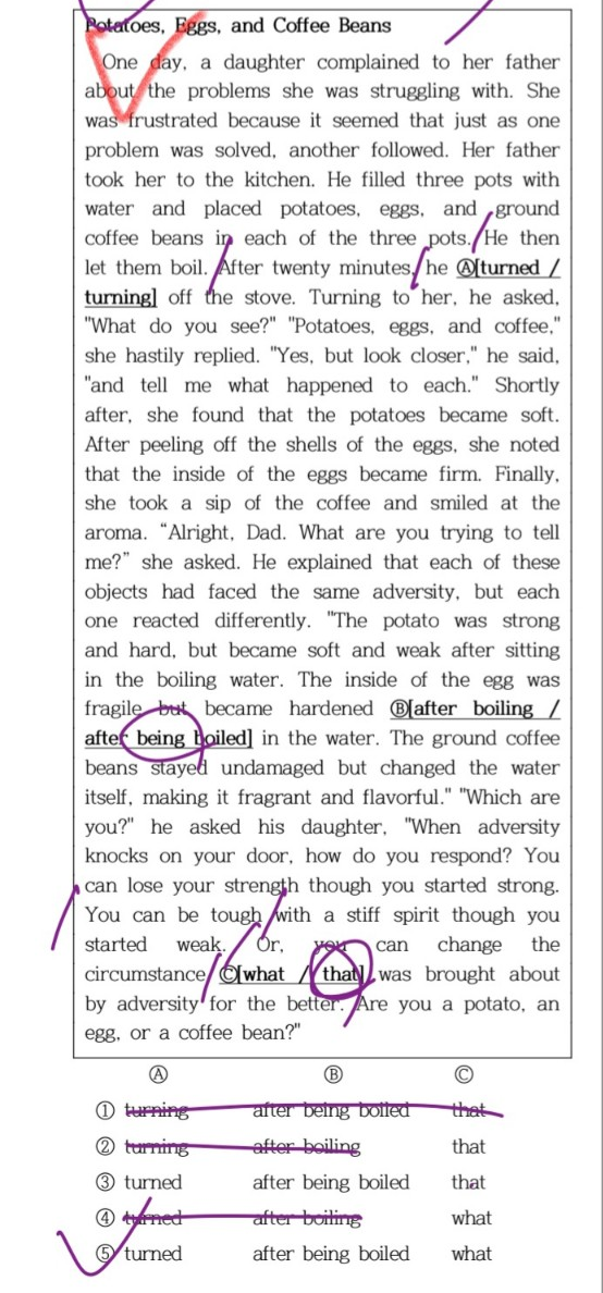 One day, a daughter complained to her father about the problems she was struggling with. She was frustrated because it seemed that just as one problem was solved, another followed. Her father took her to the kitchen. He filled three pots with water and placed potatoes, eggs, and ground coffee beans in each of the three pots. He then let them boil. After twenty minutes, he (A) turned / turning off the stove. Turning to her, he asked, "What do you see?" "Potatoes, eggs, and coffee," she hastily replied. "Yes, but look closer," he said, "and tell me what happened to each." Shortly after, she found that the potatoes became soft. After peeling off the shells of the eggs, she noted that the inside of the eggs became firm. Finally, she took a sip of the coffee and smiled at the aroma. "Alright, Dad. What are you trying to tell me?" she asked. He explained that each of these objects had faced the same adversity, but each one reacted differently. "The potato was strong and hard, but became soft and weak after sitting in the boiling water. The inside of the egg was fragile but became hardened (B) after boiling / after being boiled in the water. The ground coffee beans stayed undamaged but changed the water itself, making it fragrant and flavorful." "Which are you?" he asked his daughter. "When adversity knocks on your door, how do you respond? You can lose your strength though you started strong. You can be tough with a stiff spirit though you started weak. Or, you can change the circumstance (C) what / that was brought about by adversity for the better. Are you a potato, an egg, or a coffee bean?"