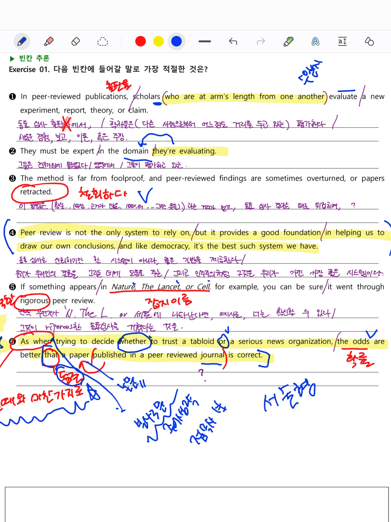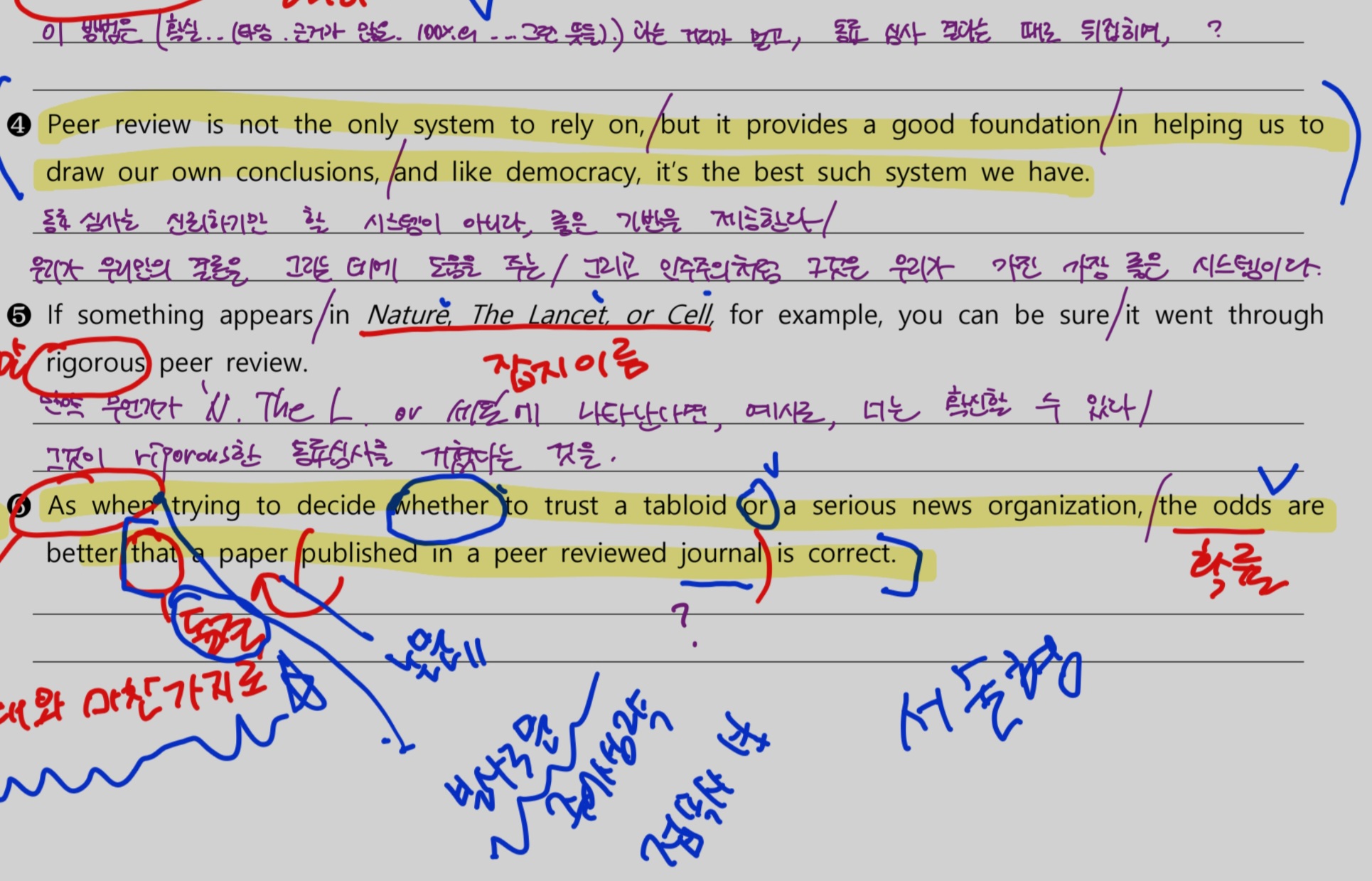 → 동료 심사는 유일한 의존 시스템은 아니지만 우리가 스스로 결론을 내리는 데 도움을 주는 좋은 기반을 제공하며, 민주주의와 마찬가지로 우리가 가진 최선의 시스템이다. - If something appears in Nature, The Lancet or Cell, for example, you can be sure it went through ____ peer review.